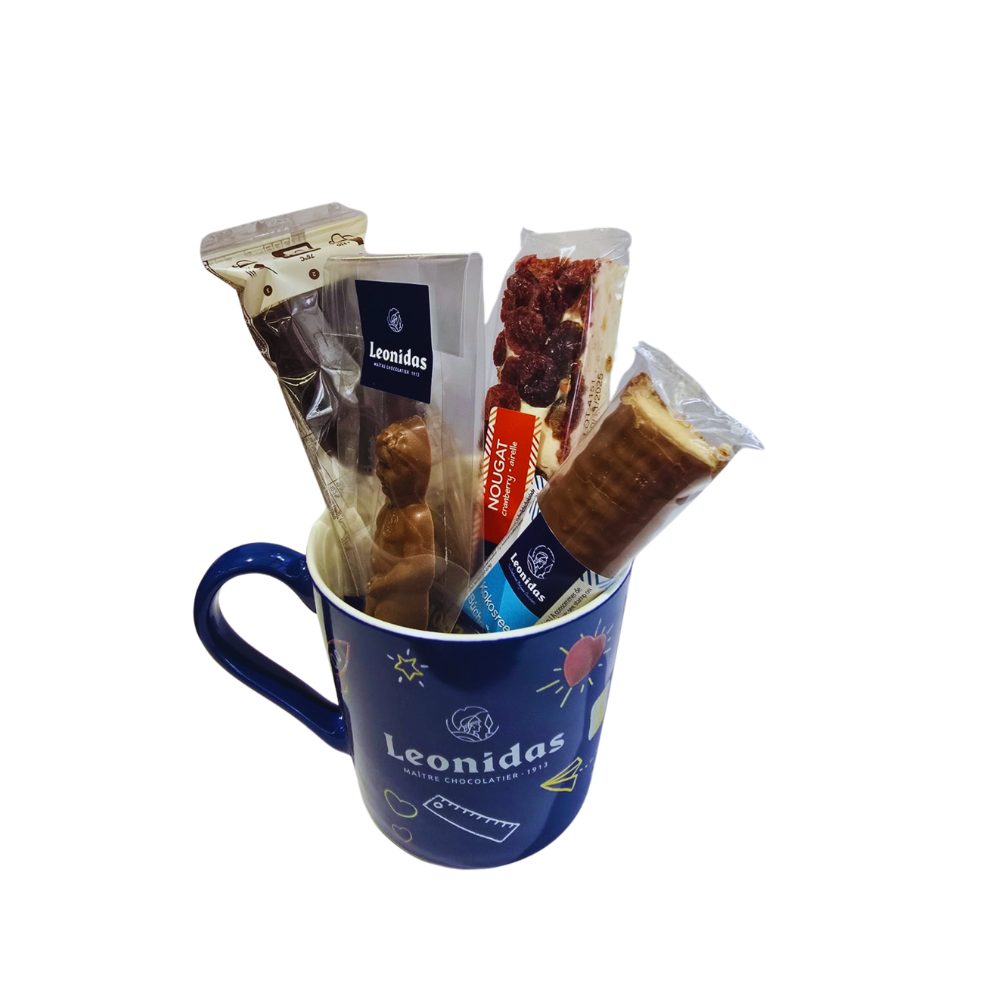 Cana Profesorului Leonidas este un cadou elegant și plin de rafinament. Conține ciocolată caldă Leonidas, o figurină din ciocolată Menneken Pis 20g, nuga 100g și batonul Buche-Coco 80g. Ideal pentru profesori, colegi sau momente de apreciere.