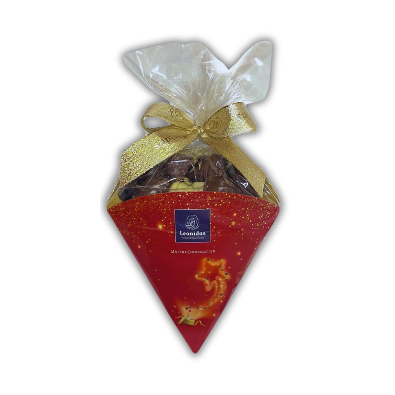 Conul de Crăciun Leonidas de 200g conține praline belgiene premium, ambalate festiv, ideale pentru un cadou elegant și savuros de sărbători.