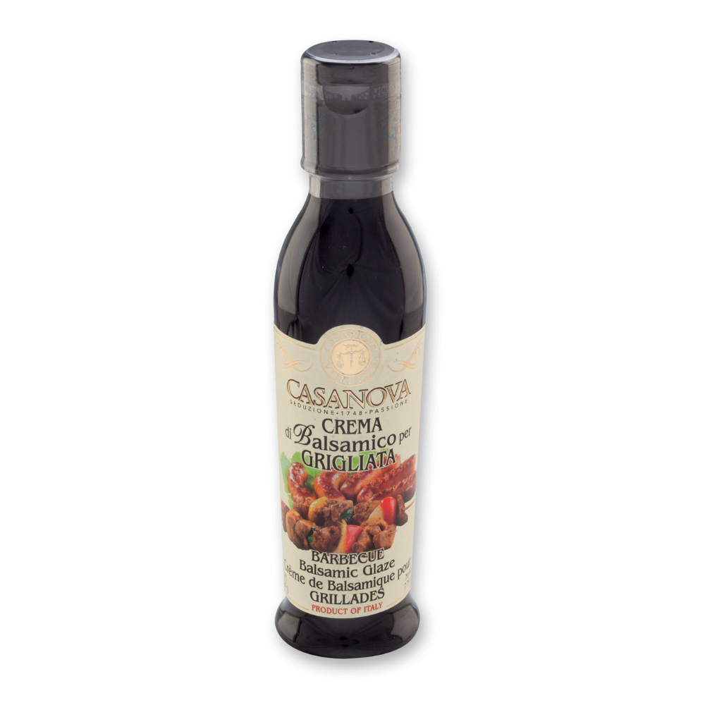 Crema balsamică italiană Casanova cu aromă barbecue. Textură densă, gust dulce-acrișor și afumat, ideală pentru grătare, carne, burgeri și legume.